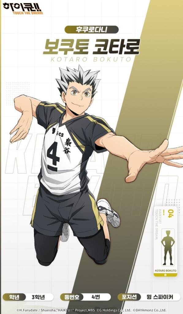 아카아시 세터의 토스를 받아 득점을 쌓는 스타일이며, 텐션이 오르면 무시무시한 공격력을 발휘하죠.